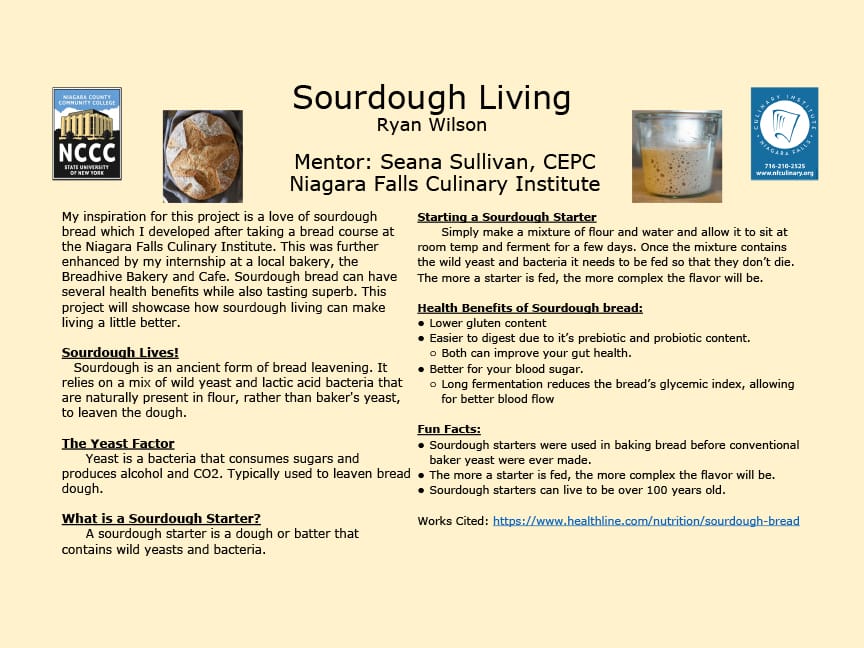 What is sourdough and how can it be beneficial towards your health? My motivation behind this project is from a love of bread making and of sharing my knowledge of how sourdough can be beneficial. The larger significance of this project is to educate people of the health benefits and versatility of sourdough bread. My background knowledge is from a developing course of learning from the Niagara Falls Culinary Institute’s Baking and Pastry Arts program, an internship at Breadhive Bakery & Cafe here in Buffalo, and a general interest in bread. The points that best summarize my exhibit are:- What is sourdough?